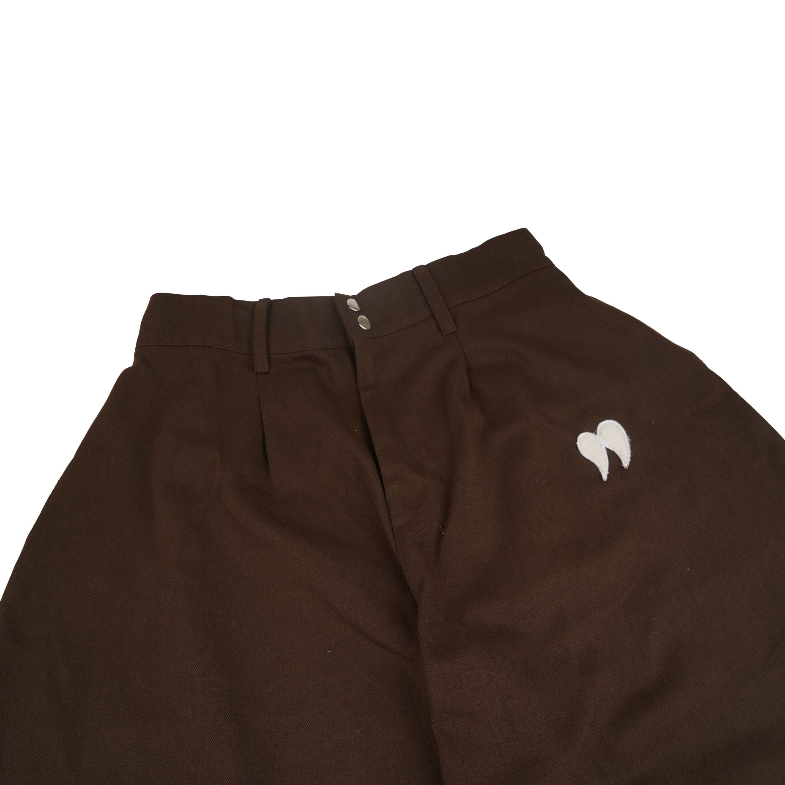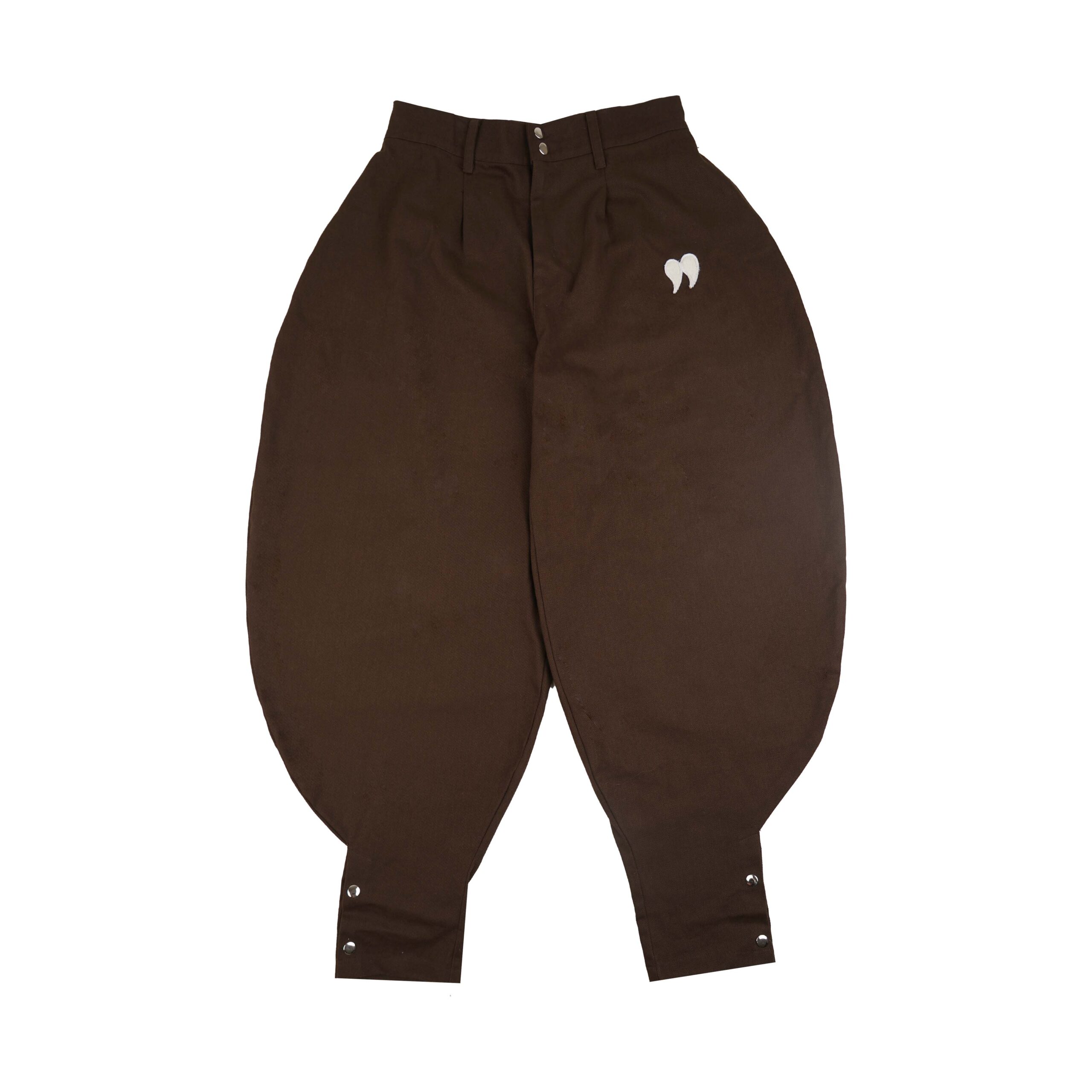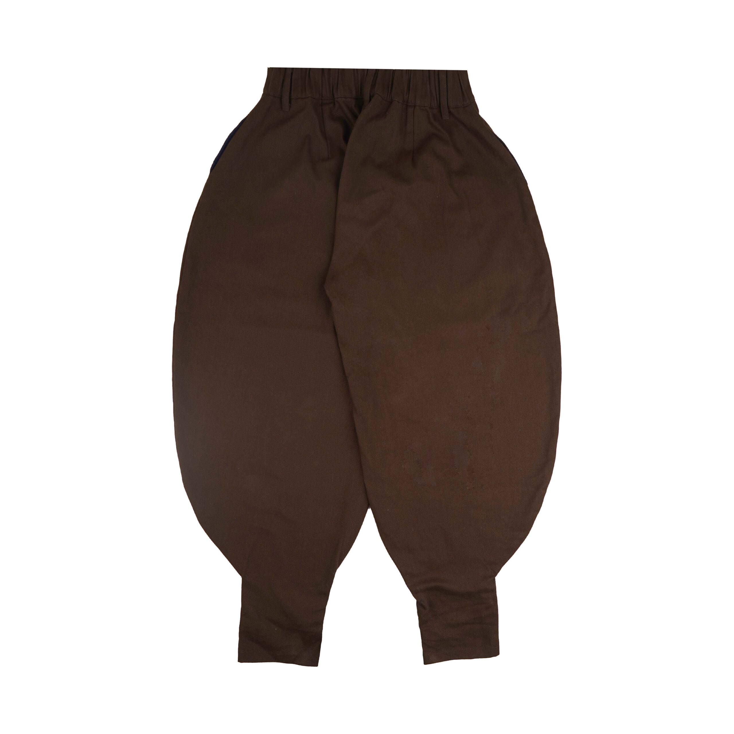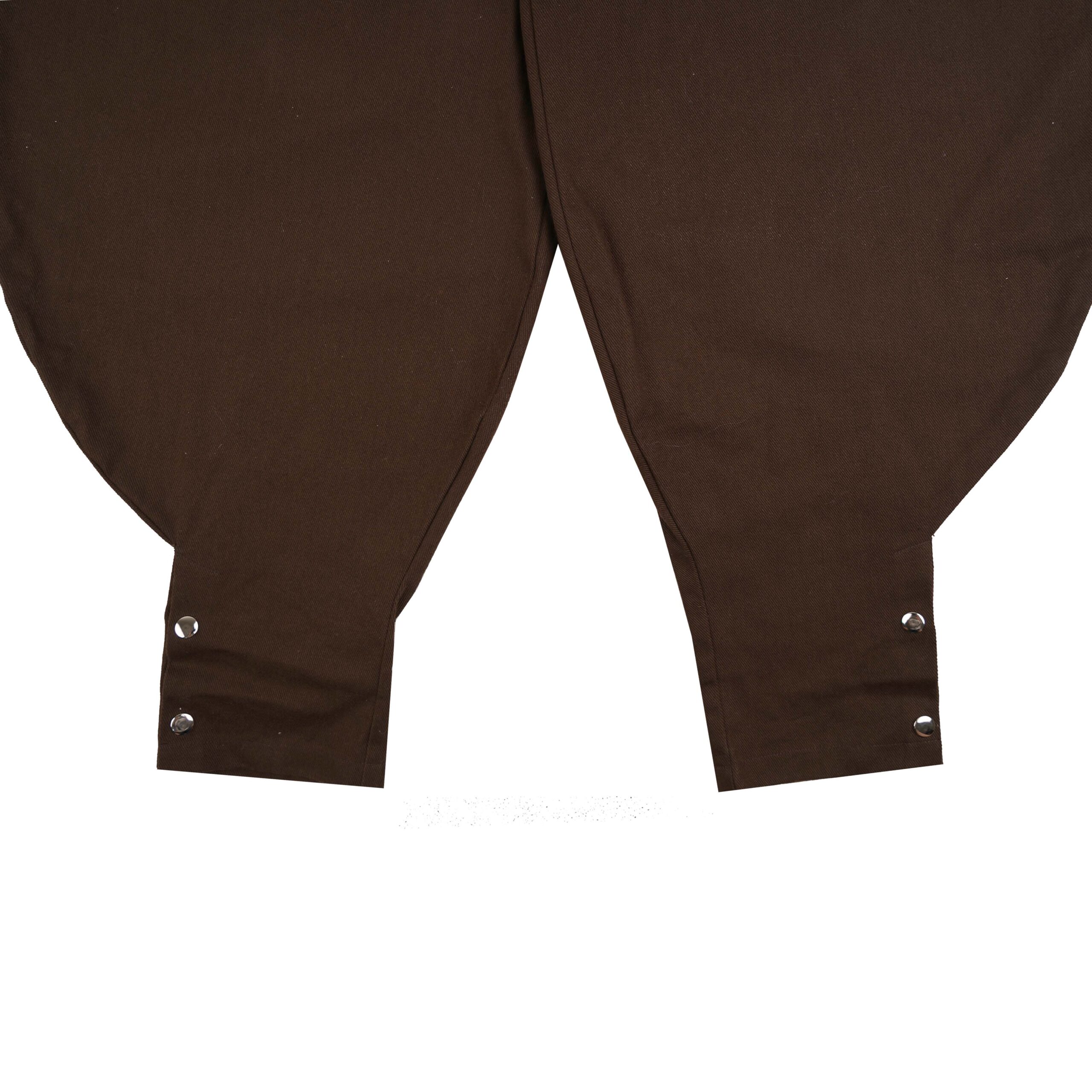 Made from 7oz Twill Cotton with a brown finish, featuring a tobi pants silhouette and bottom clip detail at the ankle.
